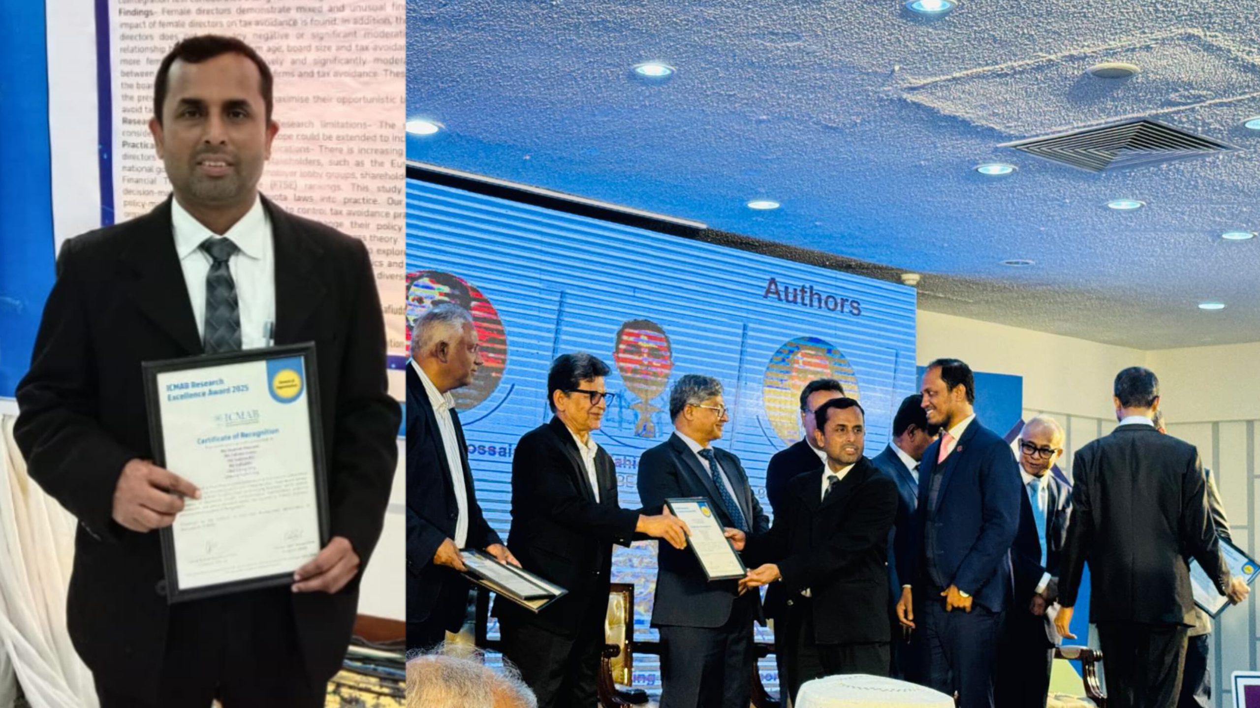 বাংলাদেশের একাউন্টিং গবেষণায় উল্লেখযোগ্য অবদান রাখায় জাতীয় কবি কাজী নজরুল ইসলাম বিশ্ববিদ্যালয়ের (নজরুল বিশ্ববিদ্যালয়) ব্যবস্থাপনা বিভাগের সহযোগী অধ্যাপক ড. মো. জাহিদুল ইসলাম ‘ICMAB Research Excellence Award 2025’ অর্জন করেছেন।