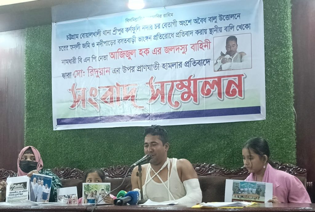 অবৈধ বালি উত্তোলনের বিরুদ্ধে প্রতিবাদ করায় ব্যবসায়ী রিদোয়ান খানকে গত ৩ জানুয়ারী মারধর করে দুই হাত ভেঙে দেয়া হয়। পুঙ্গু অবস্থায় চিকিৎসার মধ্য দিয়ে সঠিক বিচার পাওয়ার জন্য রবিবার (১১ জানুয়ারী) চট্টগ্রাম প্রেসক্লাব এস রহমান হলে সংবাদ সম্মেলনের মাধ্যমে এর প্রতিবাদ জানান ভুক্তভোগী।